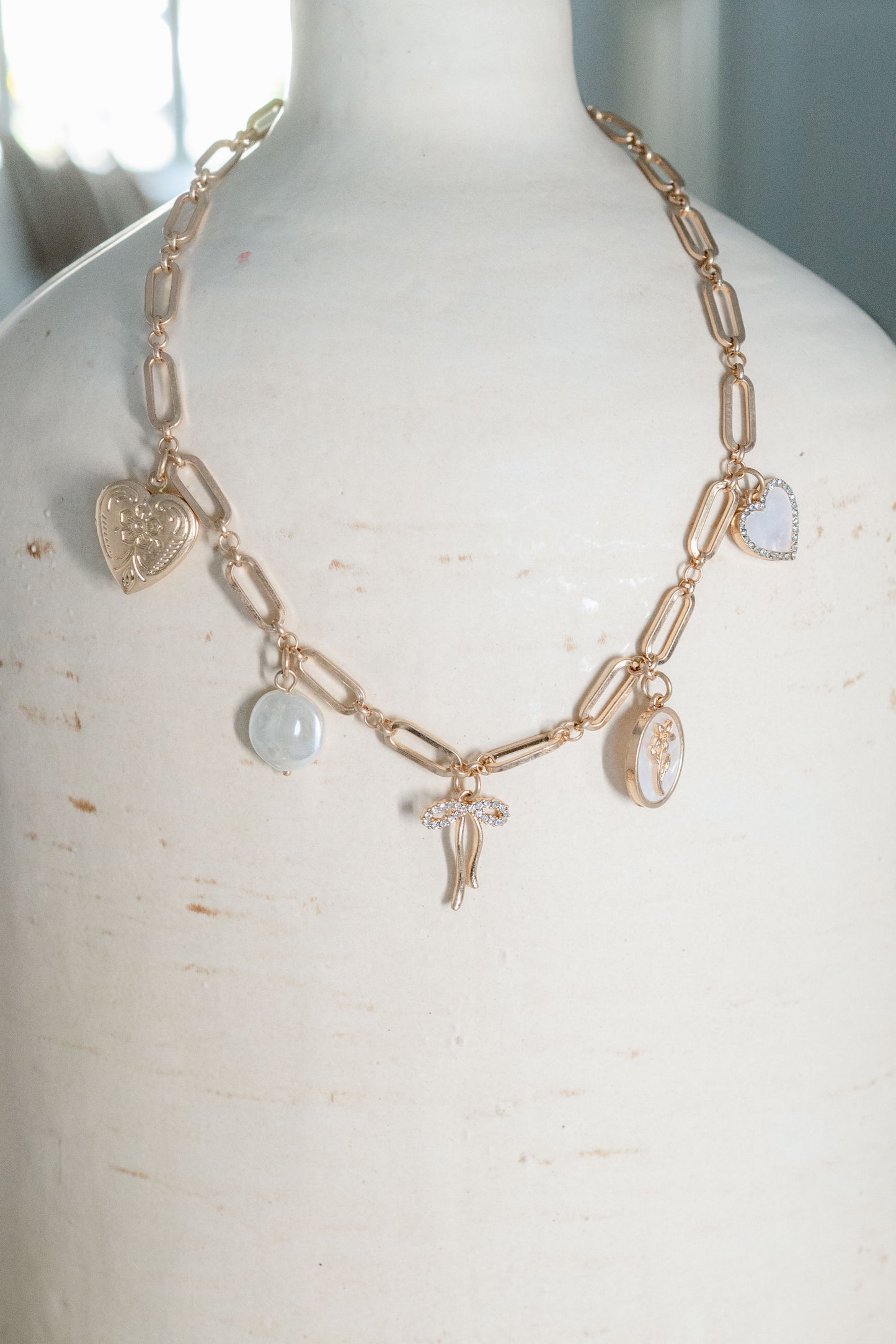 Regular price $20.80Adorned with engraved hearts, a crystal orb, a delicate floral charm, and a tiny bow, this Golden Charm Necklace radiates quiet beauty. Strung on a feminine gold chain, it's designed to celebrate the moments and memories that matter most. Wear it alone or layer it with pieces you love—either way, it brings a touch of sentimental magic to your everyday style.